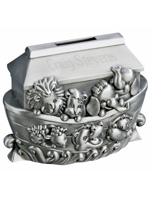 This pewter finished Noah's Ark bank features 9 sets of animals, 5 pairs on one side of the ark and 4 pairs on the other side, as they happily sail. You are sure to love the animal details! At the bottom of the ark, you can see waves splashing against the hull. The coin slot is on the very top of the Ark's roof. This version of the ark has a 3.5 in. x .5 in. smooth area on the roof on each side that is perfect for engraving. Can be personalized with a name on one side and a date on the other.