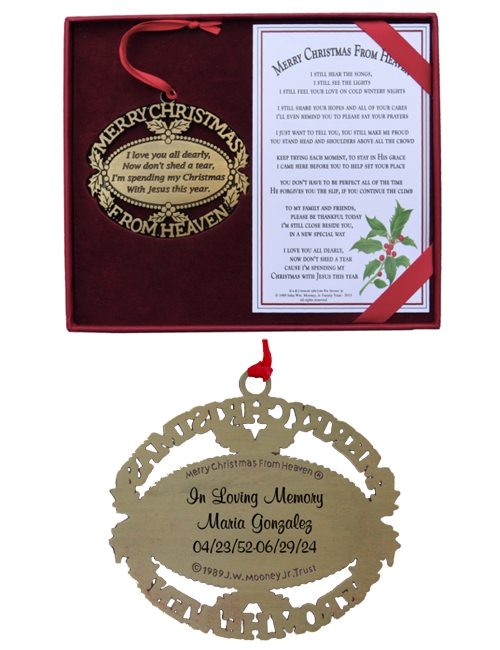 This ornament is personalized on the back . We personalize this Christmas From Heaven ornament with up to three lines of text, which is ample room for a message, a name and the dates of your loved one. Purchase one of these ornaments for each member of your family. Personalize them all the same, or make them special for each family member. A loving sister, A beloved wife, or any saying can be engraved, instead of In Loving Memory. The poem card that contains the Christmas From Heaven poem written by John Mooney is also included. The gold colored finish Christmas from Heaven ornament is tied with a red satin ribbon.